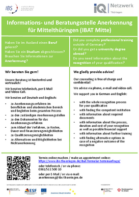 Die Informations- und Beratungsstelle zur Anerkennung in Thüringen-Mitte (IBAT-Mitte) ist Teil des IQ-Netzwerkes und wird gefördert durch das Bundesministerium für Arbeit und Soziales sowie den Europäischen Sozialfonds.