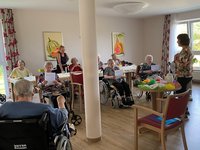 Im Anschluss gab eine erfahrende Freiwillige verschiedene Geschichten und Bewegungslieder zum Besten. Die Senioren hat´s sehr gefreut!