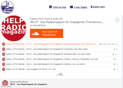 HELP! im Februar – Fasching und Narhalla-Marsch? Ja, aber nicht bei uns: Neu: unser Ehrenamtsticker auf Radio Lotte, ab sofort jeden Montag, 8.30 Uhr in der Stadtzeit mit aktuellen Gesuchen // Schülerfreiwilligentag, die Vorbereitungen laufen, Einsatzstellen für den 29.6. gesucht // Gesuche: Liebhabertheater Großkochberg, Kinderhospizdienst Mittelthüringen, Kita Arche Noah. Stricken für Babys und neue Familienpaten. Jugendschöffe werden. // Einladung zum Kurs "Sterbende begleiten lernen" des ambulanten Hospizdienstes des twsd // Einsatzmöglichkeiten auch für Menschen mit Einschränkungen gesucht. // Termine: Einladung zur MachBar am 28.2. in die VHS und zum Benefiz-Event zu Gunsten des Margarethe-Geibel-Fonds am 7.3. in die Stadtbibliothek // auf musikalischer "Reise" mit Christina Lux, Mazze Wiesner, Tina Rogers, Laing und Powerman 5000...