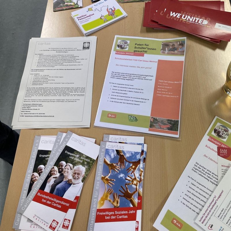 Andrea Liebe vom Begegnungscafé der Caritas in der Thomas-Müntzer-Straße – jetzt CariCare – ist dringend auf der Suche nach Absolventen für das freiwillige soziale Jahr. Offen und nicht schüchtern sollte man sein – auch eine Stelle im Bundesfreiwilligendienst für das Projekt, das sich seit vielen Jahren geflüchteten Menschen in Weimar widmet, sei noch zu vergeben. Interessierte erwartet eine, ihren Fähigkeiten angepasste, abwechslungsreiche Tätigkeit und ein Taschengeld von 350 €. Cafédienst, Beschäftigung mit Kindern, Hausaufgabenhilfe, Ansprechpartner sein und auch mal hauswirtschaftliches sind Teil der zu erledigenden Aufgaben.