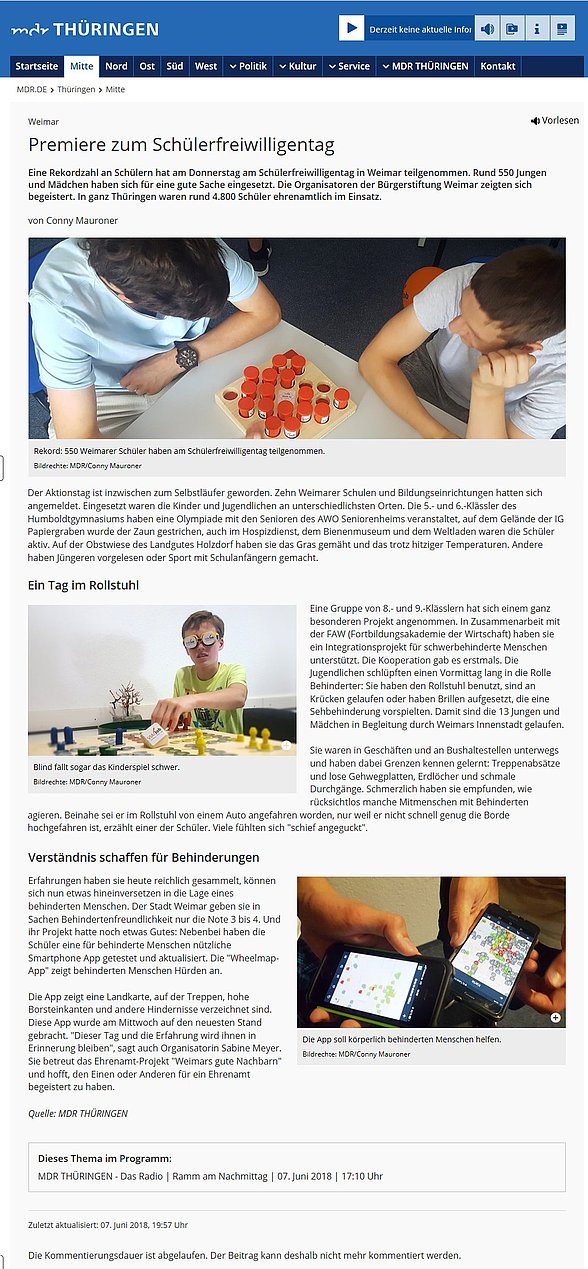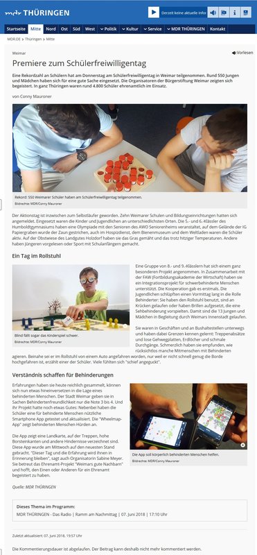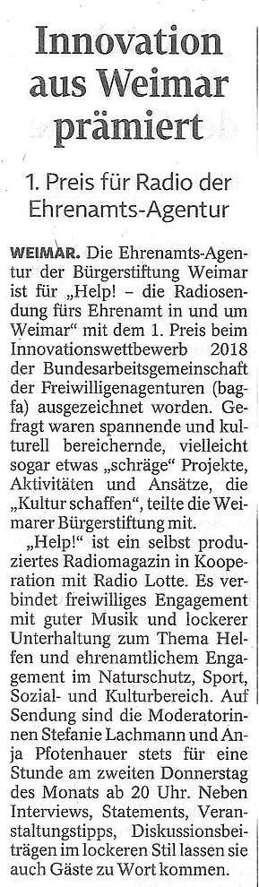 Weimar. Zum Internationalen Tag des Ehrenamts gibt es heute eine Sondersendung bei Radio LOTTE Weimar. In der Livesendung kommen von 9 bis 12 Uhr gemeinnützige Einrichtungen und Engagierte aus ganz Thüringen zu Wort. Dazu gehören aus Weimar Sabine Meyer, Seniorenbegleiter, Stefan Engelhardt, Stadtsportbund und Heidi Kästner von Wir sind Paten.