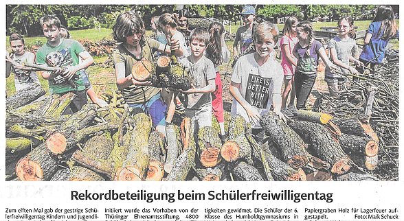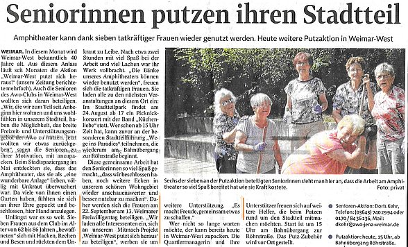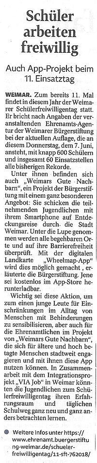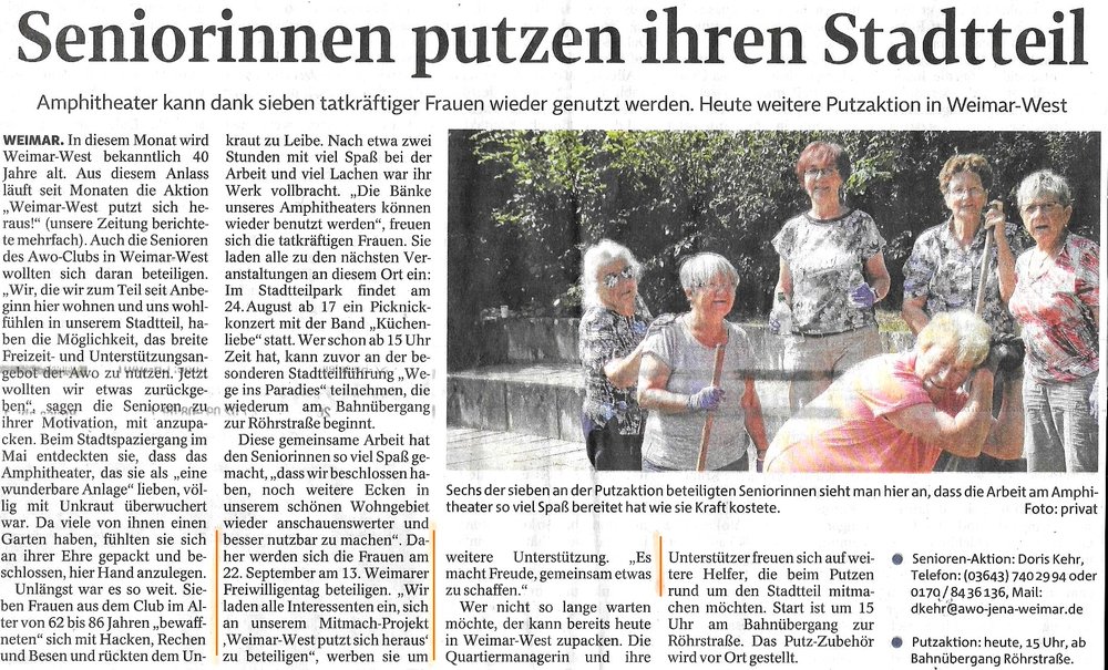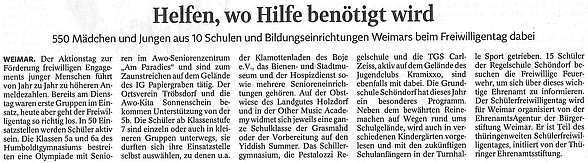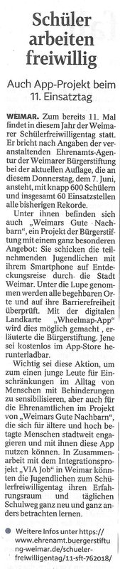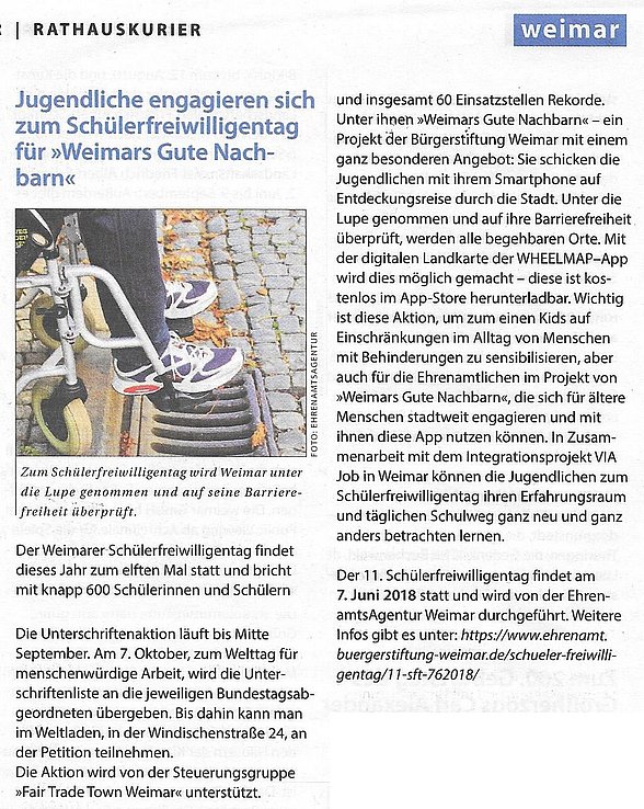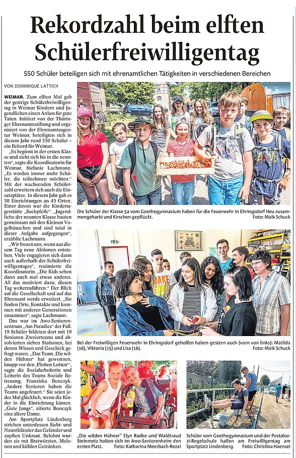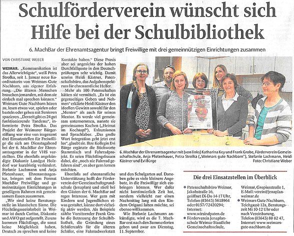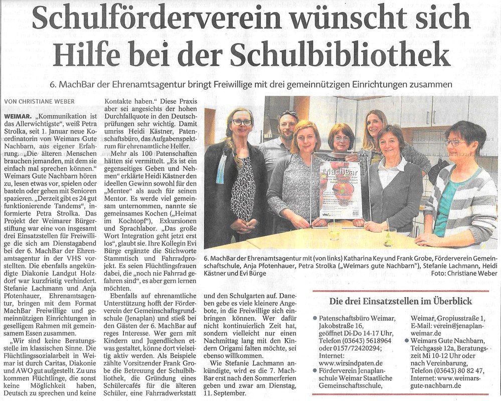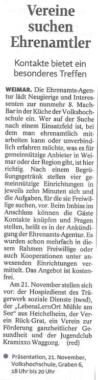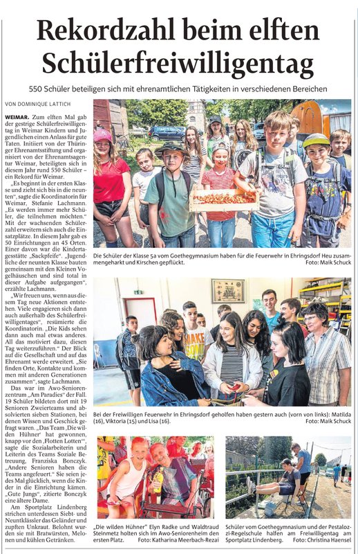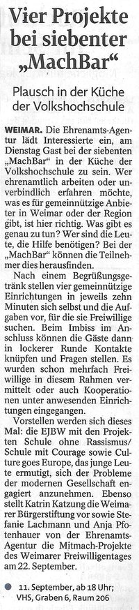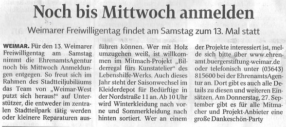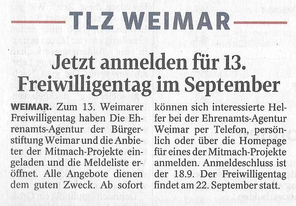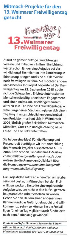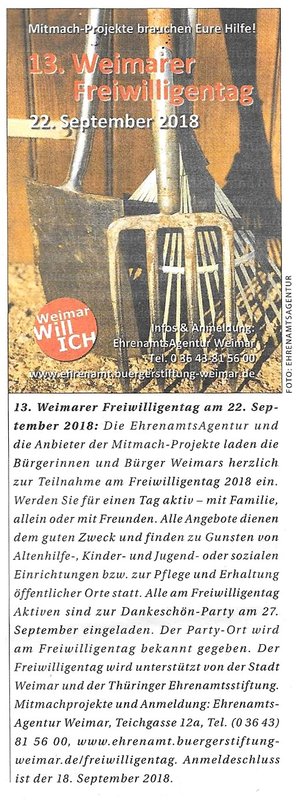 Zum Abschluss stellte Stefanie Lachmann von der EhrenamtsAgentur die Mitmach-Projekte des Weimarer Freiwilligentages, der am 22.9. stattfindet, vor. Besonderer Bedarf an freiwilligen Helfern bestehe noch in den Angeboten „Grüne Hölle, öde Steppe“, bei dem ein Einsatz im Schulgarten der Grundschule Weimar-Schöndorf geplant ist. Auch für den „Herbstputz bei Johannes“ sind noch Plätze frei. Die Johanneskirche in Oberweimar bedarf einer Grundreinigung mit Fensterputz und Spinnwebenbekämpfung. Für das Projekt „Weimar-West putzt sich heraus!“ sind vor allem Ortsteilbewohner angesprochen, im zentralen Stadtteilpark gemeinsam für Ordnung zu sorgen oder auch kleinere Reparaturen rund um das Gemeindezentrum Paul-Schneider zu erledigen. Auch für den Bilderregalbau im Kunstatelier der Lebenshilfe werden noch Holzhandwerker gesucht. Diese und weitere Mitmach-Projekte samt Einsatzdetails, sowie die Möglichkeit der Anmeldung findet man unter www.ehrenamt.buergerstiftung-weimar.de/freiwilligentag