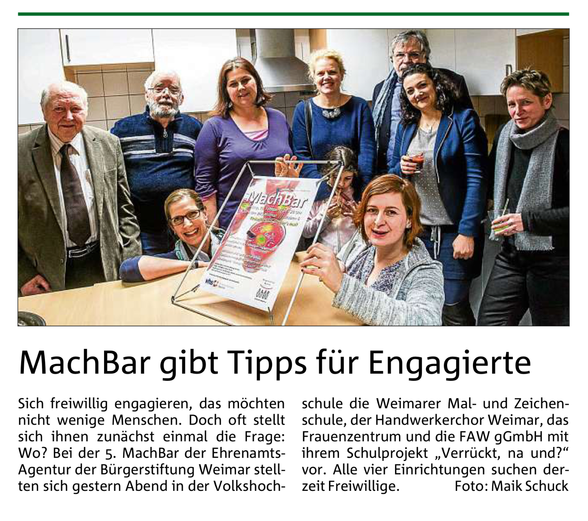 Mitmachen. Aber wo? Das fragen sich viele Menschen, die auf der Suche nach einem freiwilligen Engagement sind. Was passt zu mir? Wer sind die Leute, die meine Hilfe möchten? Was gibt es dort konkret zu tun?Die MachBar ermöglicht Einsatzstellen und interessierten Freiwilligen, in lockerem Rahmen zusammen zu treffen. Nach einem alkoholfreien Begrüßungscocktail stellen, in jeweils 10 Minuten, 4 Einrichtungen ihre Aufgaben für Freiwillige vor. Beim anschließenden Couscous-Essen können Fragen gestellt und persönliche Kontakte geknüpft werden.