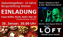 im Loft (Carl-August-Allee 12) mit einem zünftigen spanischen Tapas-Buffet, Musik und einem noch nicht verratenen Beitrag zu „Reden über 10“ mit Förderern, Freunden und Stifter(innen) der Bürgerstiftung.
