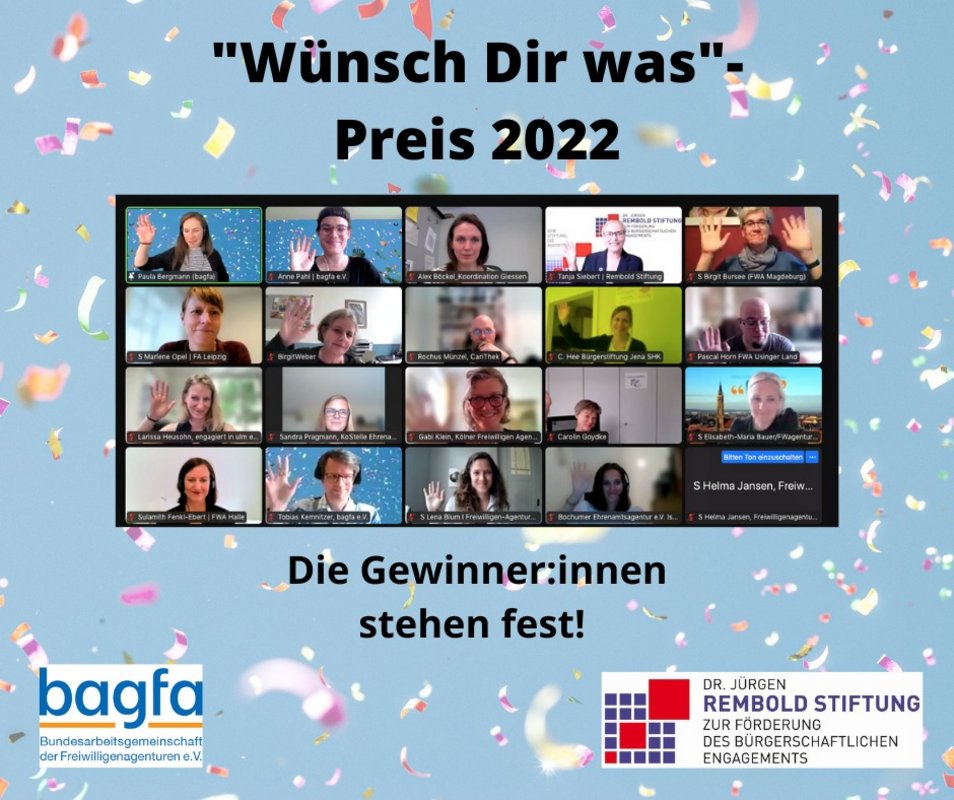 Diese Fragen standen im Mittelpunkt der diesjährigen Ausschreibung zum „Wünsch Dir was“-Preis 2022, ausgelobt von der Dr. Jürgen Rembold Stiftung zur Förderung des bürgerschaftlichen Engagements. Im Rahmen einer digitalen Preisverleihung wurde die Auszeichnung nun, am 20. Juni 2022, an insgesamt sechs Freiwilligenagenturen vergeben.