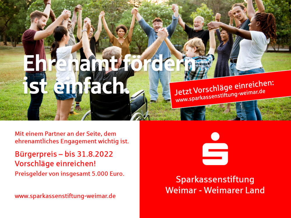 Der Bürgerpreis ist mit insgesamt 5.000 Euro dotiert und wird im Rahmen einer Feierstunde am 9. Dezember 2022 übergeben. . Vorschläge können über ein Online-Formular auf der Internetseite der Sparkassenstiftung www.sparkassenstiftung-weimar.de eingereicht werden. Bewerbungsende ist der 31. August 2022.