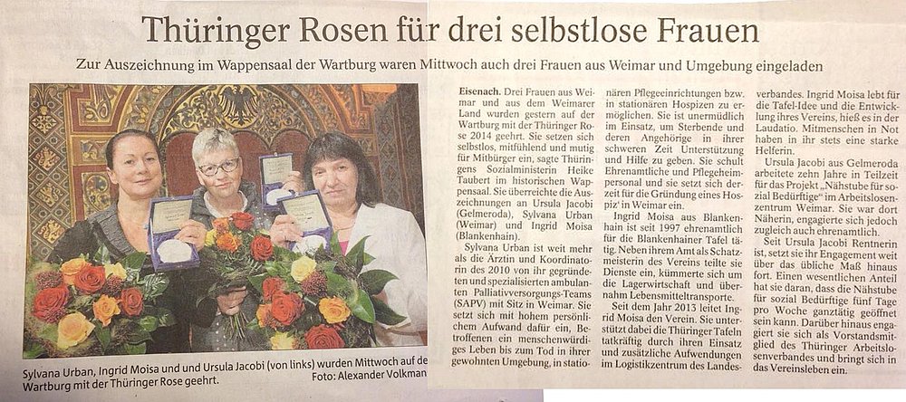 Sylvana Urban, Ingird Moisa und Ursula Jacobi (v.l.) wurden Mittwoch auf der Wartburg mit der Thüringer Rose geehrt. Foto: Alexander Volkmann, TA